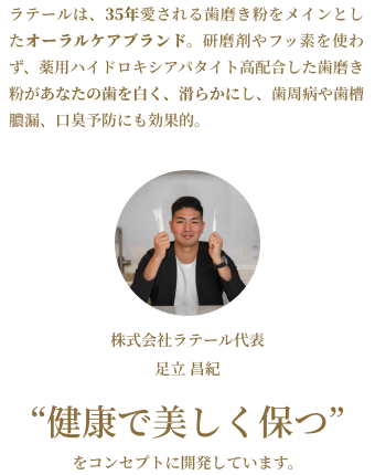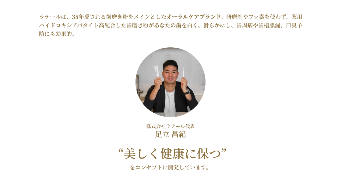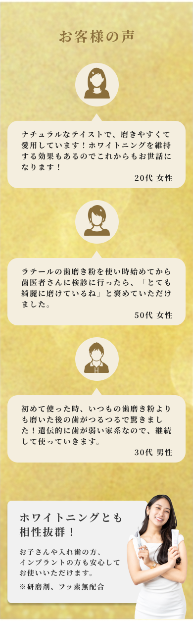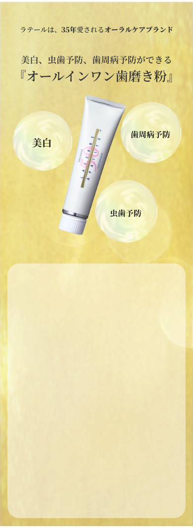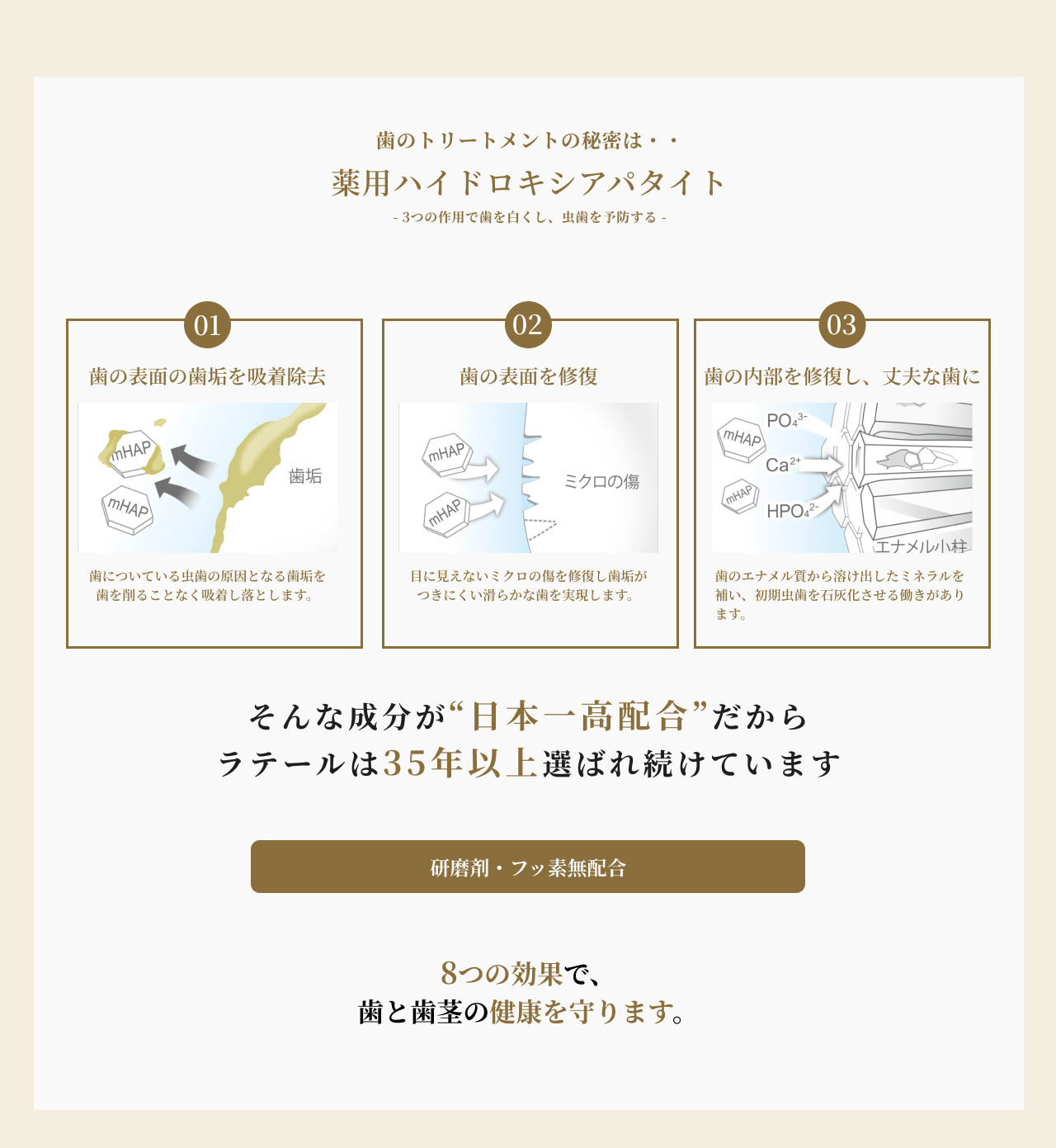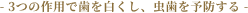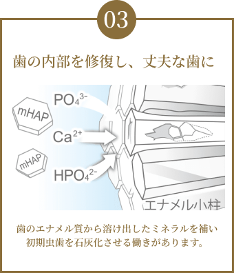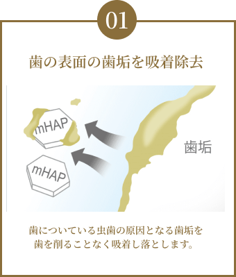 歯垢の吸着除去や微小欠損した歯の補修、 初期虫歯を石灰化し進行を防止する効果があります。
